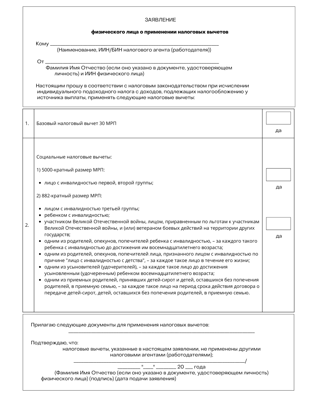 Базовый и социальные налоговые вычеты предоставляются работникам только на основании заявления, согласно пункту 2статье 437 Налогового кодекса РК.