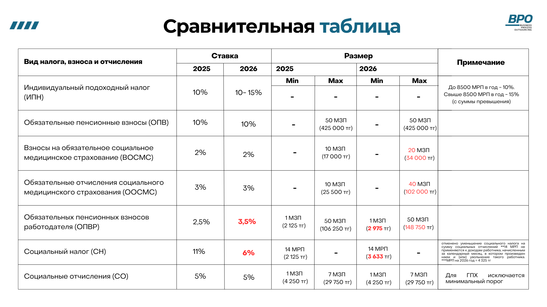 Ставка 3% без изменения, верхний предел дохода для расчета отчислений увеличивается с 10 МЗП (850 000 тг) до 40 МЗП (3 400 000 тг). Максимальные отчисления увеличивются с 25 500 тг до 102 000 тг.